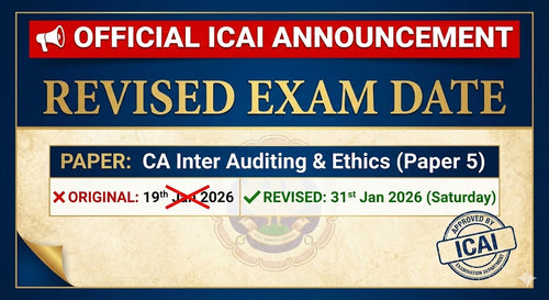 🔔 Official Exam Update The Institute of Chartered Accountants of India (ICAI) has officially POSTPONED the following exam: Paper: CA Inter Group II - Paper 5 (Auditing & Ethics) Original Date: 19th January 2026 (Monday) Status: Postponed (India & Abroad) New Date: Announced. Check our Blog 📄 Download Official ICAI...