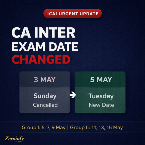 ICAI has officially rescheduled the CA Intermediate Examination for May 2026. The exams will now begin from 5th May 2026 (Tuesday) instead of 3rd May 2026 (Sunday). Timings remain 2 PM to 5 PM IST. Group I: 5th, 7th & 9th May. Group II: 11th, 13th & 15th May. CA...